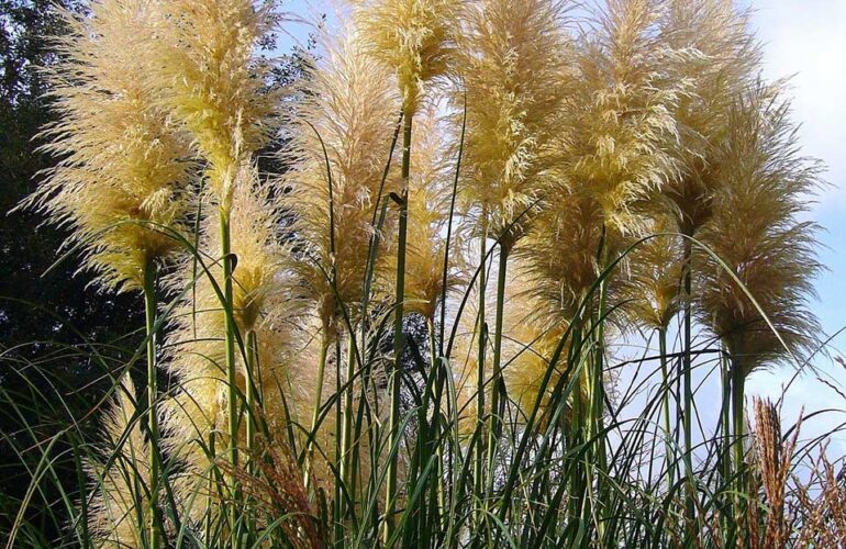 Jednym z nich jest na pewno trawa pampasowa (Cortaderia), wyjątkowo okazała bylina, wyrastająca na 2-3 m. Tworzy gęstą kępę łukowatych liści, na której szczycie we wrześniu pojawiają się niezwykle efektowne, srebrzyste, kremowe lub różowe puszyste kwiatostany. To roślina rodem z Ameryki Południowej, więc wymaga zimowej ochrony. Wysoko wyrasta także miskant chiński (Miscanthus sinensis), sięgający 2 metrów. Ma jasnozielone, pasiaste liście i atrakcyjne, puszyste wiechy kwiatów – srebrnoszare albo różowopurpurowe, w zależności od odmiany. Metrowe kępy tworzy także trzcinnik ostrokwiatowy Overdam (Calamagrostis acutiflora) o wąskich zielonych liściach z kremowym brzegiem. Już w czerwcu zaczyna kwitnąć – kępę strzelistych liści wieńczą puszyste, różowe wiechy, które po przekwitnięciu zmieniają się w równie ładne, beżowe kłosy. Dzięki temu trawa pozostaje dekoracyjna przez cały rok.